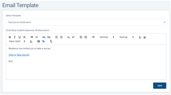 As an example, the Take Survey Notification contains a simple text containing a survey link. All text can be edited with full HTML formatting capability. The # symbol indicates a system-generated parameter, such as #instance that will be replaced by your instance name in the actual emails that are sent out.
