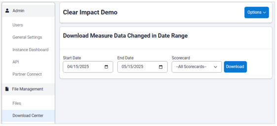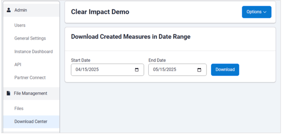 The Download Created Measures feature allows users to download measures created within a specific date range. Users can choose what dates to filter by.