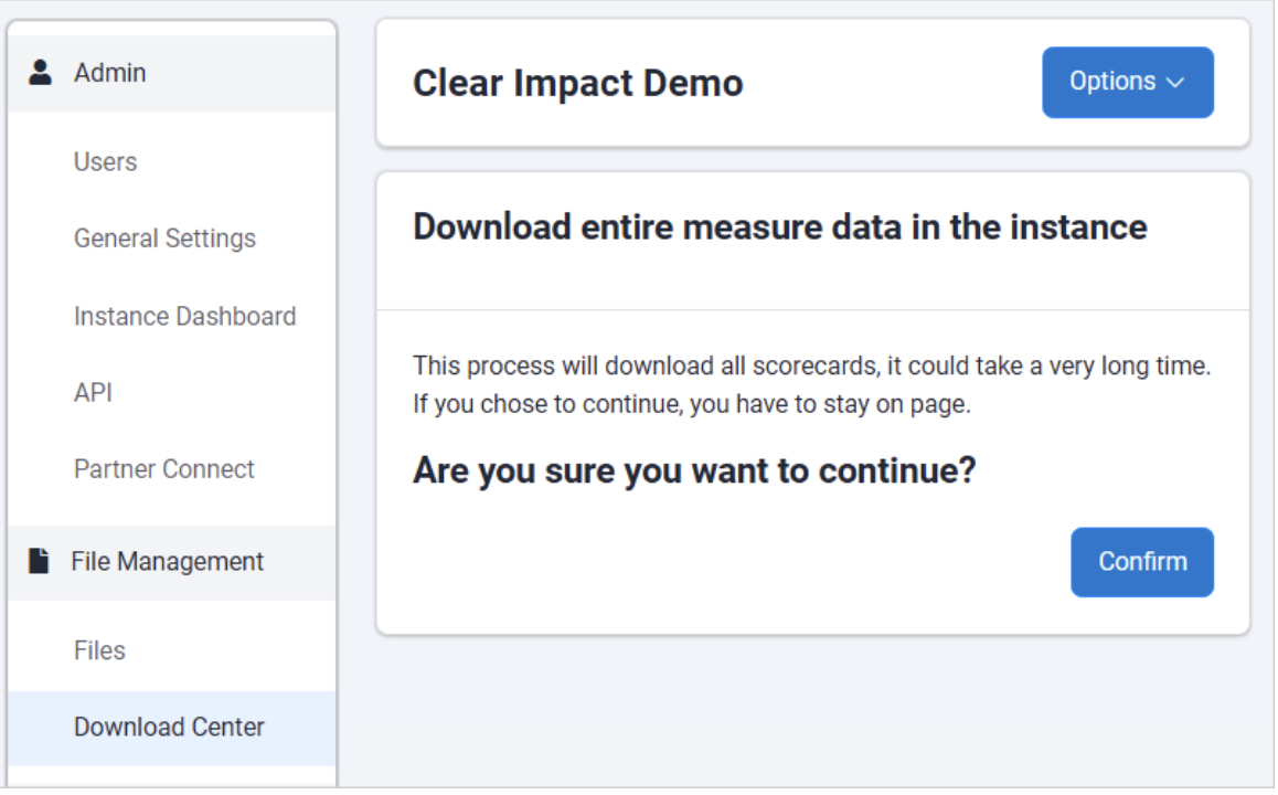 The "Download All Measures" option will allow users to export a file of all measures and data from within the instance