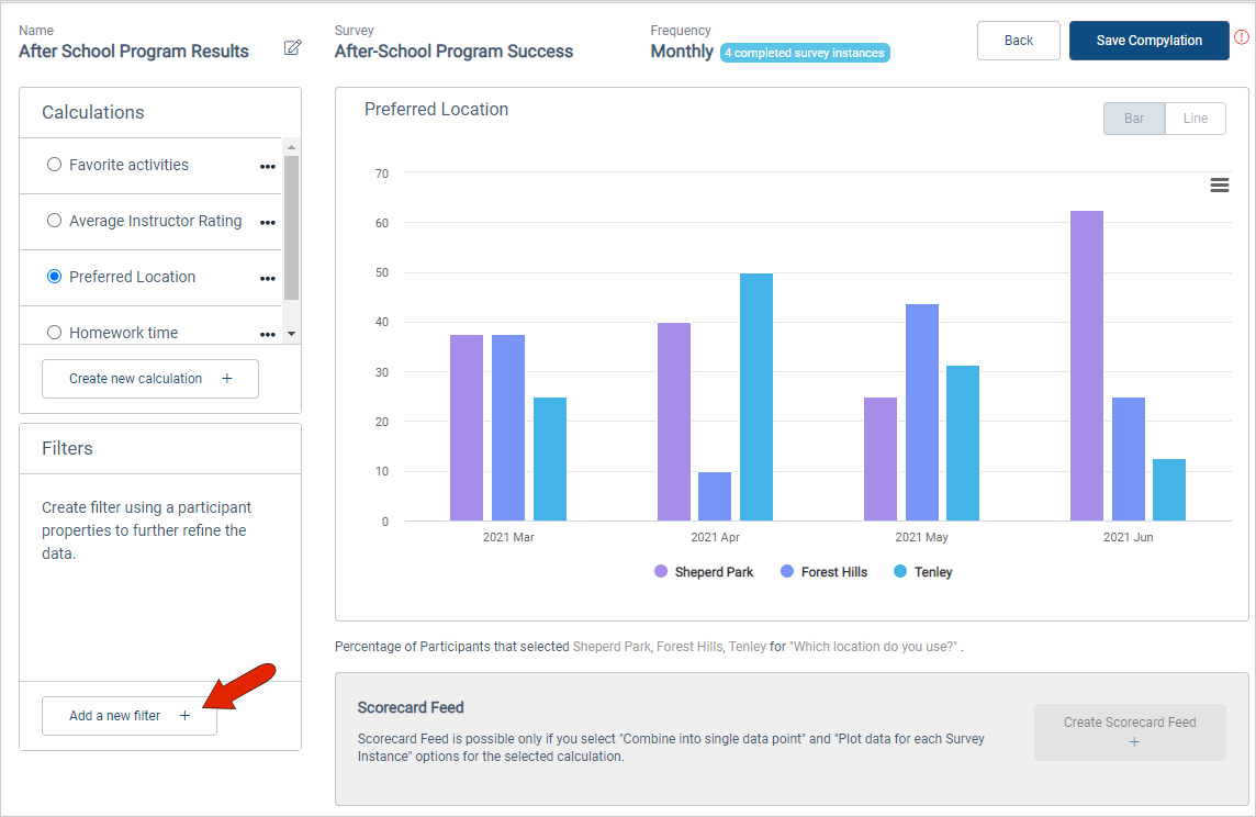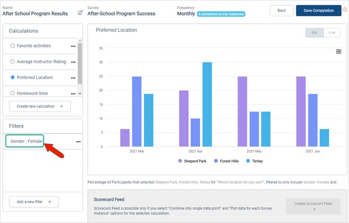 Note: Filtering is different than segmenting, which can be used to present a demographic breakdown of results for a single calculation. Filters apply to ALL calculations in the same Compylation.