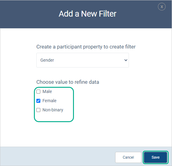 After clicking Save, the filter is applied. In this example, the results now include only data from female participants.