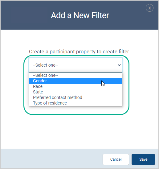 Default filters are race, gender, and state. Custom participant / organization fields and custom group fields will also appear on this list. This example will use the Gender filter.