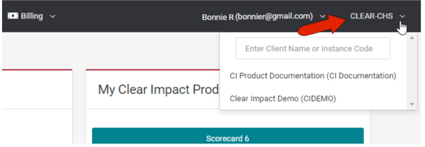 Your current instance is listed at the top right. If your organization has multiple instances, clicking the instance name opens a drop-down menu you can use to switch to another site