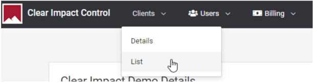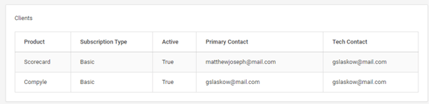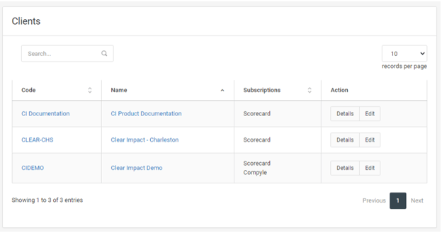 The Clients list is a searchable and sortable table, listing each instance name, code and subscriptions.