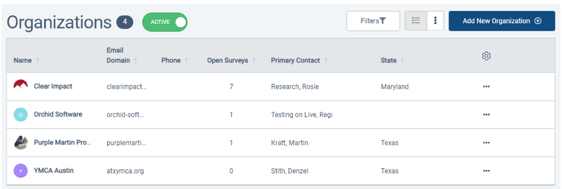 The Organizations list presents a sortable and searchable table, in which each organization is listed along with demographic data and number of open surveys.