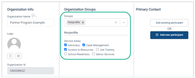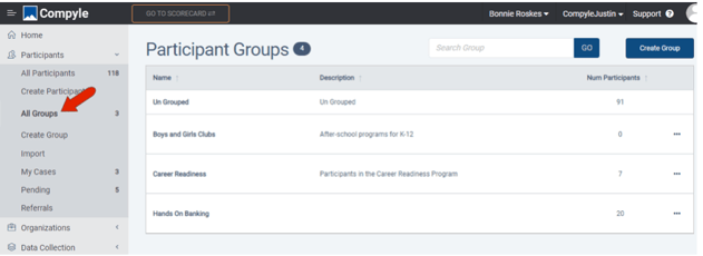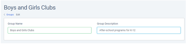 Groups are used to categorize participants or organizations. For example, if your agency works with at-risk teens and new mothers, you can create a group for each set of participants.
