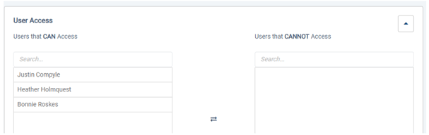 In the User Access section, choose the Compyle users who have permission to access the group. Access means the ability to edit the group or create or edit custom group fields, view participant / organization records for group members, and search for participants using group fields.