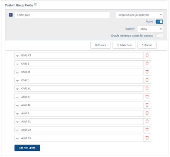 As an example, custom participant fields for this group will collect single-choice answers for T-shirt size, and number answers for school grade.