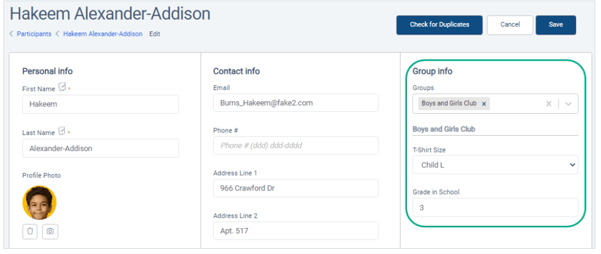 Custom participant fields can be configured for groups as needed.