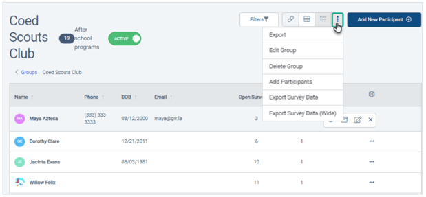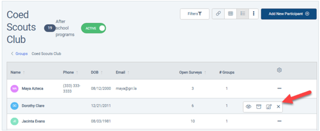 In the list of group participants / organizations, clicking the three-dot icon provides options to view, delete/archive, or edit the participant / organization, as well as an option to remove the participant / organization from the group.