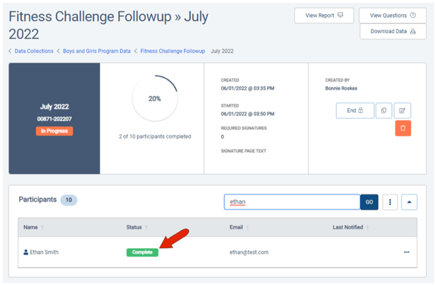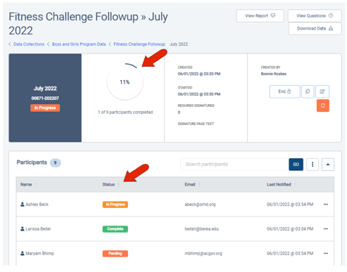 If a participant saves responses before completing, their status listed in the survey instance will be In Progress. Once they save and complete, the status updates to Complete. Note that a participant does not have to answer all questions (aside from required questions) before marking the survey as complete. Participants who have not yet started are marked as Pending. Overall participant progress is indicated at the top of the instance.