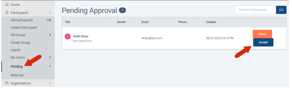 Instead, the participant will be listed as Pending, and you can access pending participants from the sidebar. From here, you can accept or reject the participant.