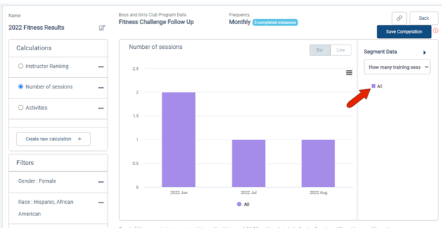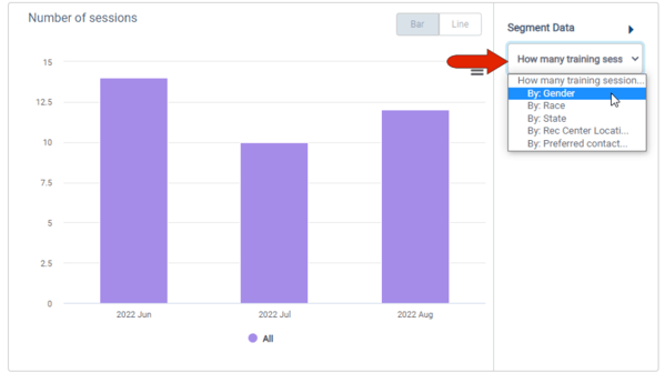 To segment results, click txrhe question drop-down in the Segment Data section. Available filters are the standard race, gender, and state, along with any custom participant fields or group fields. This example will apply the Gender filter.