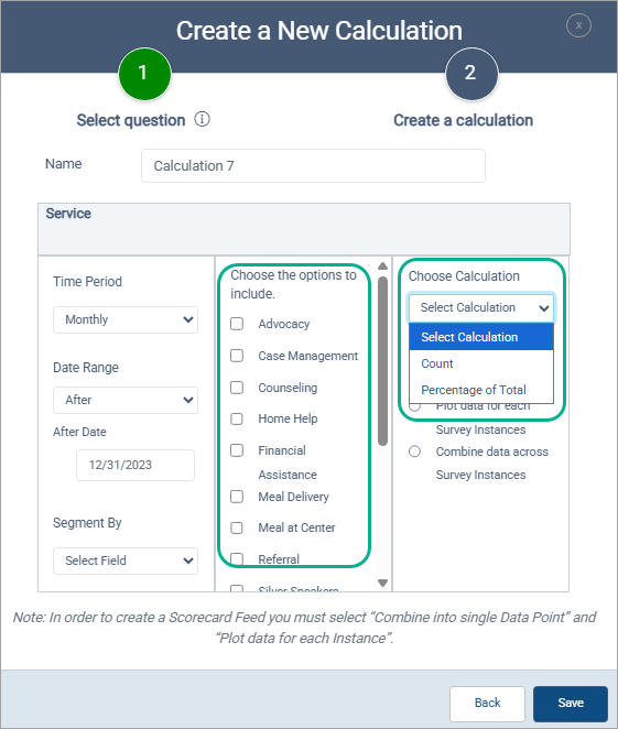 In this example, the survey question has a multiple check box format. So calculations can be only Count or Percentage of Total, and you can choose which answer choices to include. Including “Unanswered” means that responses will be counted from participants who skipped this question. You would see similar options for single-choice responses.