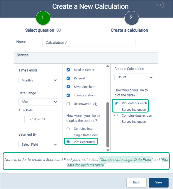 Because this type of question has multiple answers, you also have the option of combining all answers into a single data point, or plotting each answer separately. Separated data provides more detailed results, but you won’t be able to create a scorecard feed. With separated data, you also cannot segment the data.
