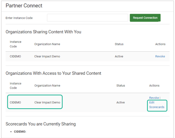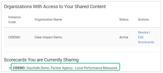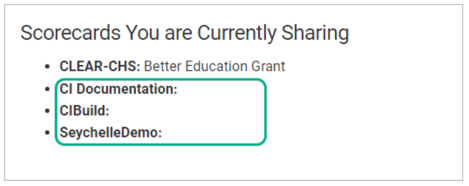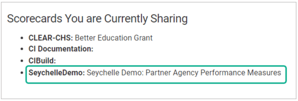 16. Review the list of Scorecards You Are Sharing and see that the partner agency now has access to the scorecard you just shared with them.