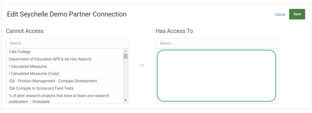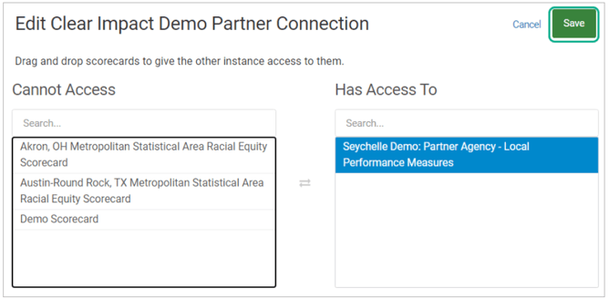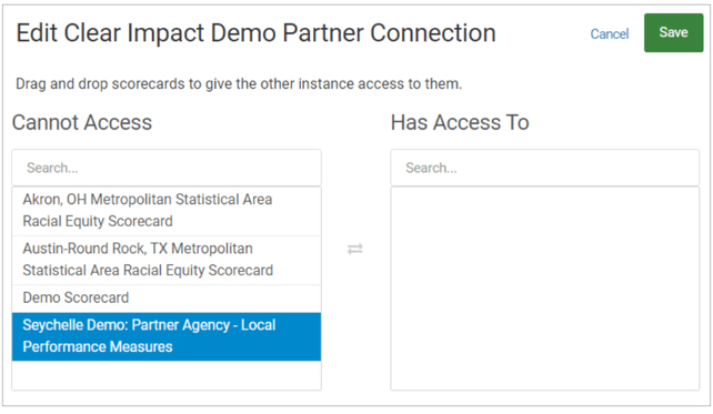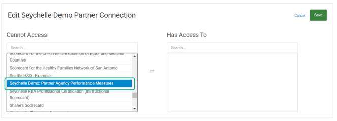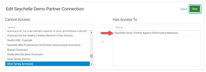 12. When the Edit Partner Connection page opens, you will see a Cannot Access list of unshared scorecards and a Has Access To list of shared ones. If the partner agency's reporting scorecard is not in the Has Access To list, you will need to add it.