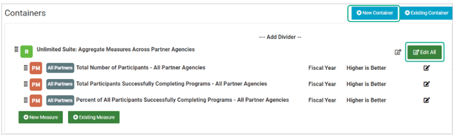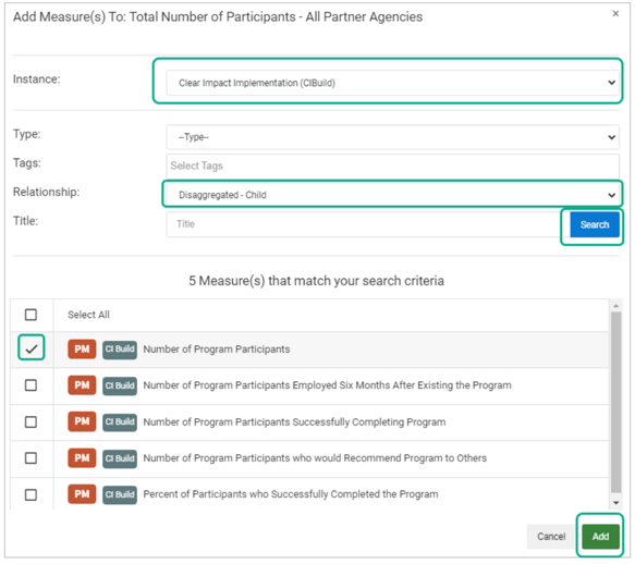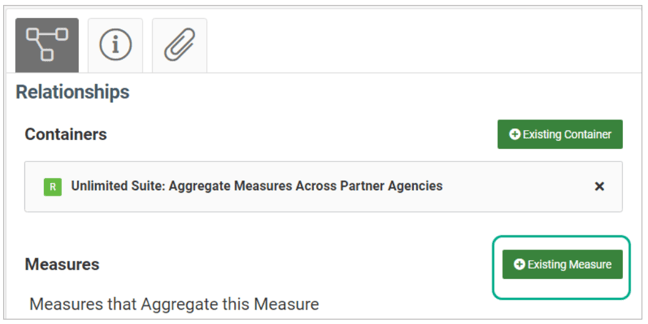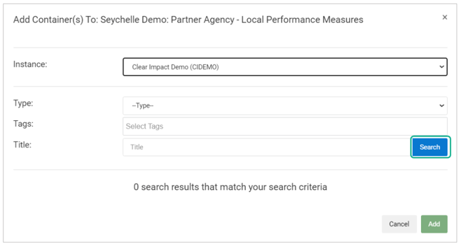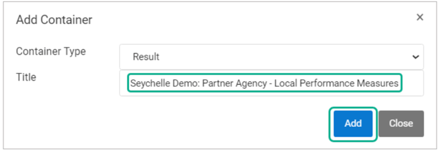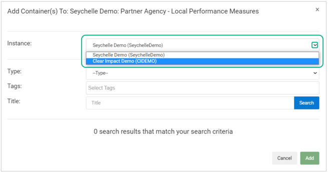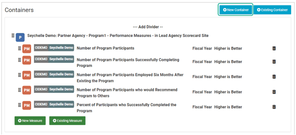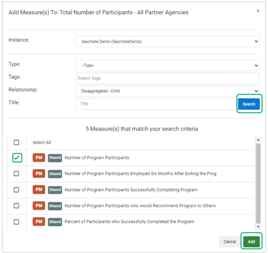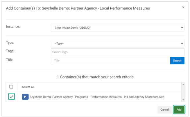 8. Click the Add button to add them to the local measures scorecard for reference. The shared container will display in the Containers section, and each shared measure will be tagged with the lead agency site code.