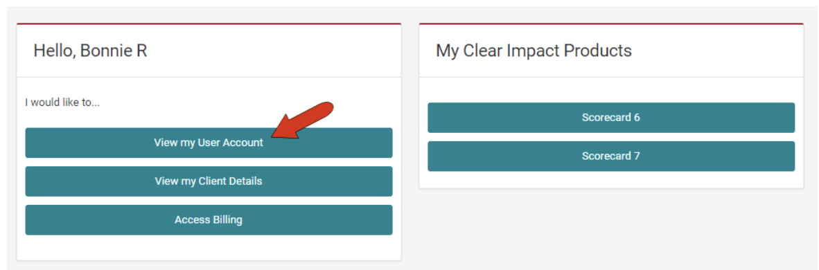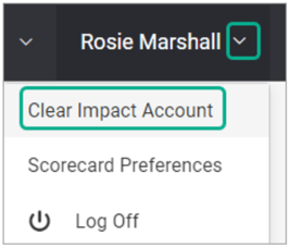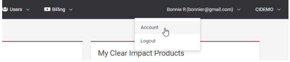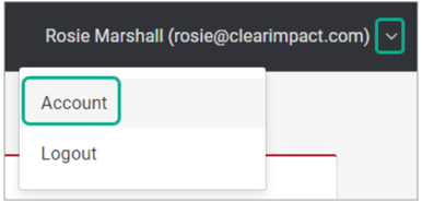 To change your password to something memorable, login to Clear Impact Software with your current password. Look for your user name in the top right and expand the menu there. Choose the "Account" option, which is labeled differently depending on where you are.