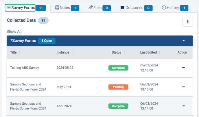 Back at the top, the Survey Forms tab displays all survey responses the participant, household, or organization has been invited to take, along with the response status of Complete, Pending (not yet started), and Incomplete (started but not finished). Clicking a survey will show the participant’s responses.