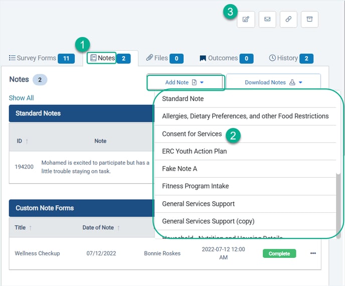 In the Notes tab, you can view existing notes, or add your own. A standard note can contain regular text, or you can fill in a custom note type that was added by your own organization.