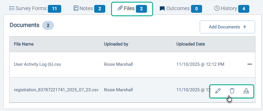 The Files tab is where you can upload any general files related to the participant, household, or organization, such as an ID or address verification. (The File field type is another option for adding files to the participant forms directly. Hovering over the three-dot icon for a document displays icons you can use to edit (replace), delete, or download a document. Each file must be 100 MB or smaller.