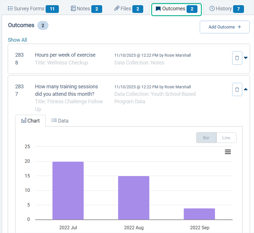 On the Outcomes tab, you can analyze data for any question from any survey response or note record for just this participant, organization, or household.