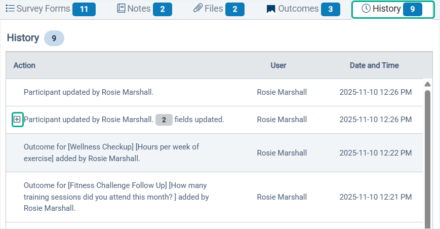 The last tab is History, which lists all activity related to this participant / organization, including edited fields, assigned and submitted surveys, notes, and documents. An entry with a plus sign indicates that a field was changed while editing the participant, household, or organization.